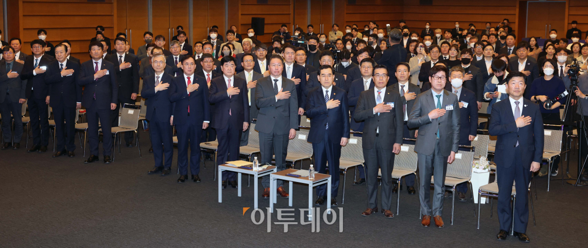15일 서울 중구 대한상공회의소에서 열린 제50회 상공의 날 기념식에서 이창양 산업통상자원부 장관, 최태원 대한상공회의소 회장과 산업훈장 수상자들이 국민의례를 하고 있다.