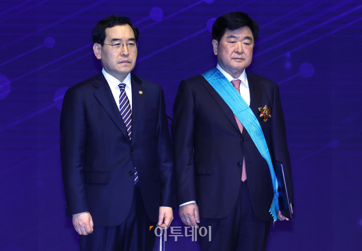 15일 서울 중구 대한상공회의소에서 열린 제50회 상공의 날 기념식에서 이창양(왼쪽) 산업통상자원부 장관과 금탑산업훈장 수상자인 권오갑 HD현대 회장이 기념촬영을 하고 있다.