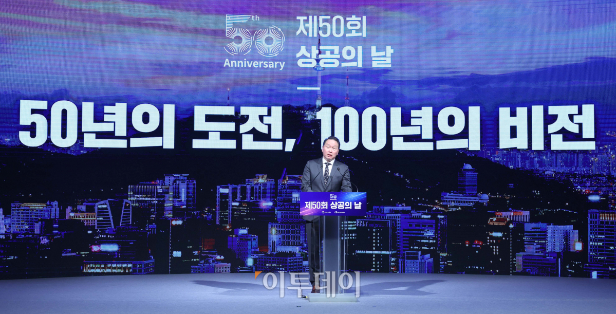 15일 서울 중구 대한상공회의소에서 열린 제50회 상공의 날 기념식에서 최태원 대한상공회의소 회장이 기념사를 하고 있다.
