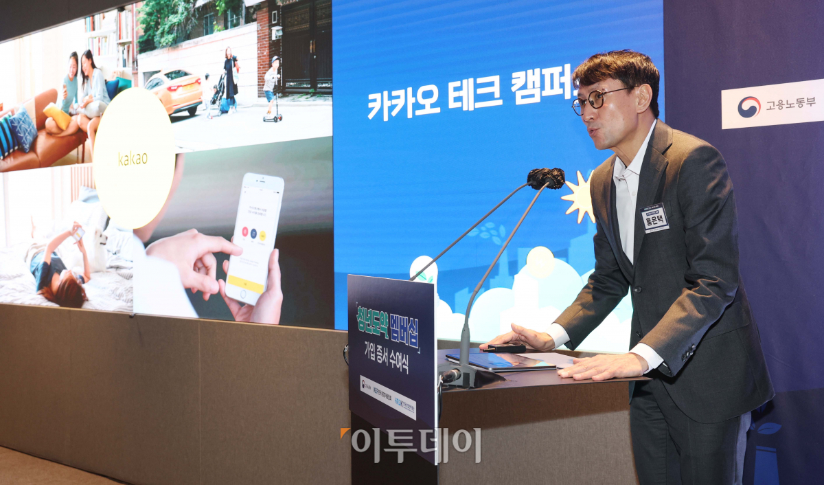 홍은택 카카오 대표가 17일 경기 성남시 카카오 판교 아지트에서 열린 한덕수 국무총리 ‘청년 함께 기업(氣-UP)’ 현장 방문 행사에서 프로그램 운영계획에 대해 발표하고 있다.