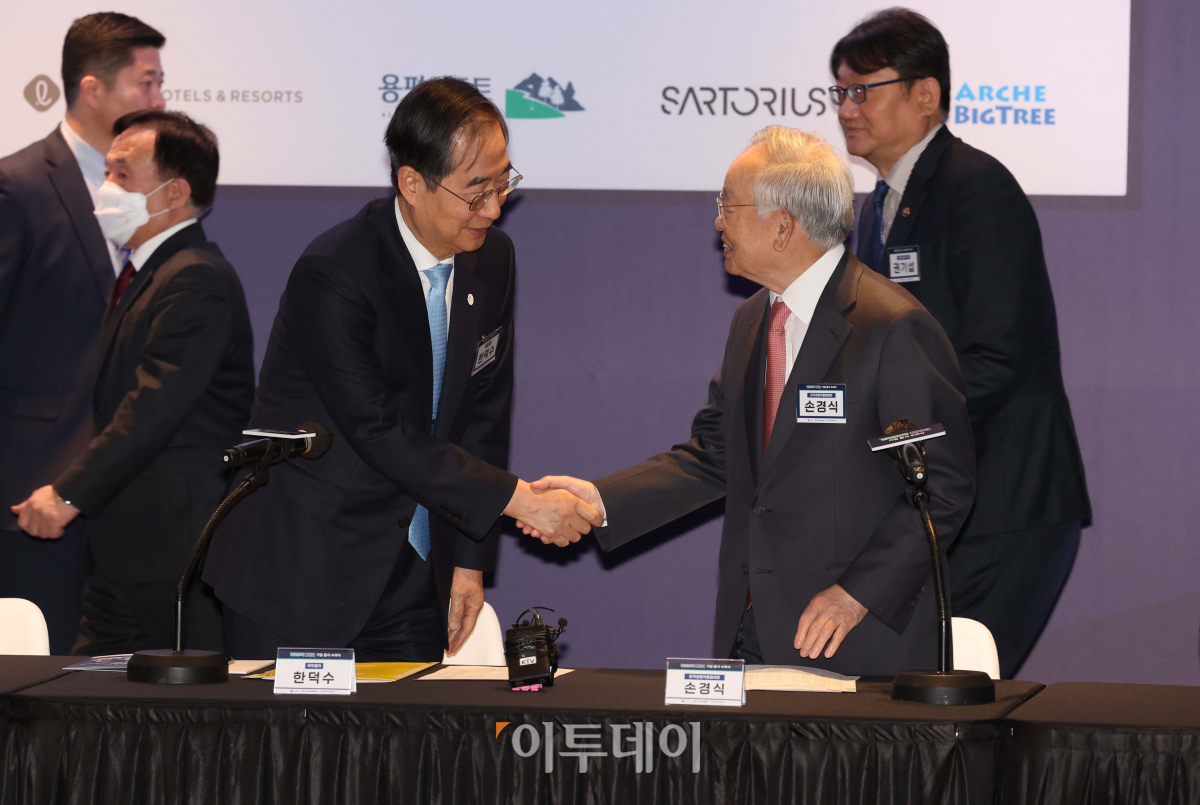 [포토] 인사하는 한덕수 국무총리-손경식 경총 회장