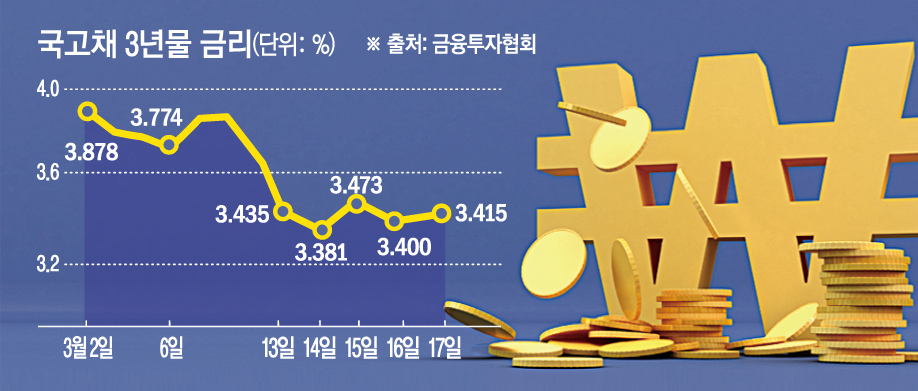 19일 금융투자협회에 따르면 지난 17일 국고채 3년물 금리는 전 거래일보다 0.015%포인트(p) 상승한 연 3.415%로 최종 고시됐다. 국고채 금리는 전날 미국채 금리의 약세를 반영해 상승 출발했지만, 장중 상승 폭을 되돌리며 강보합으로 마감했다.