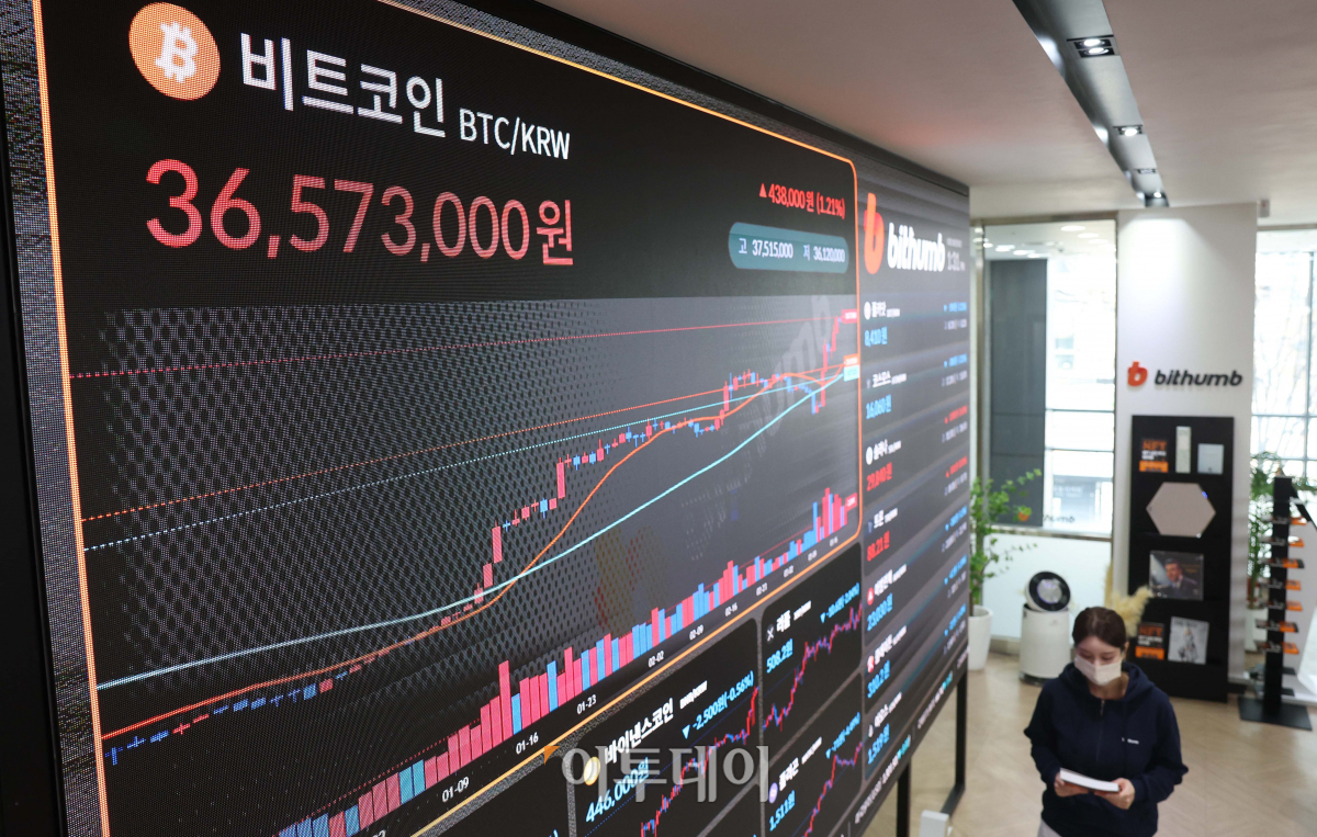 최근 오름세를 지속하는 비트코인 가격이 금융시장 혼란에도 지난해 6월 이후 처음으로 2만8000달러(약 3660만원)를 돌파했다. 19일(현지시간) 블룸버그통신에 따르면 비트코인은 이날 장중 2만8258달러(약 3700만원)까지 상승, 올해 들어서만 70% 가까이 올랐다. 이같은 상승세는 세계 금융업계의 혼란과 예상을 뛰어넘는 인플레이션에도 가상화폐가 위험 헤지수단으로 인식되고 있기 때문으로 풀이된다. 20일 서울 서초구 빗썸 고객센터에 비트코인 등 가상화폐 실시간 거래 가격이 표시되고 있다.
