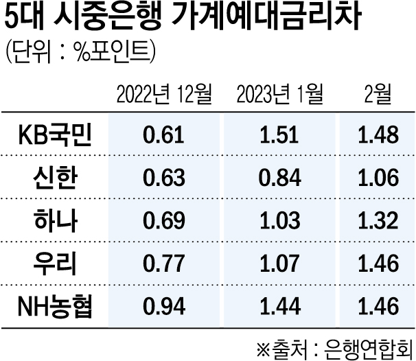 KB국민은행의 가계 예대금리차(가계대출금리-저축성수신금리)는 1.48%포인트(p)로 집계됐다. NH농협은행(1.46%p), 우리은행(1.46%p), 하나은행(1.32%p), 신한은행(1.06%p) 순으로 가계 예대금리차가 컸다.