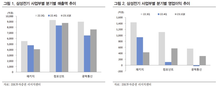 김운호 IBK투자증권 연구원은 "삼성전기의 2023년 1분기 매출액은 2022년 4분기 대비 4.1% 증가한 2조481억 원으로 예상한다. 패키지 사업부는 부진하지만, 컴포넌트 사업부는 소폭 증가, 광학 통신 사업부는 10% 이상 증가할 것"으로 전망했다.