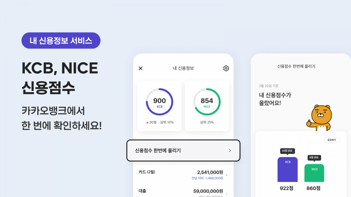 카카오뱅크는 '내 신용정보 서비스'에서 코리아크레딧뷰로(KCB)와 NICE평가정보(NICE)의 신용점수를 모두 확인할 수 있도록 서비스를 확대한다고 22일 밝혔다.