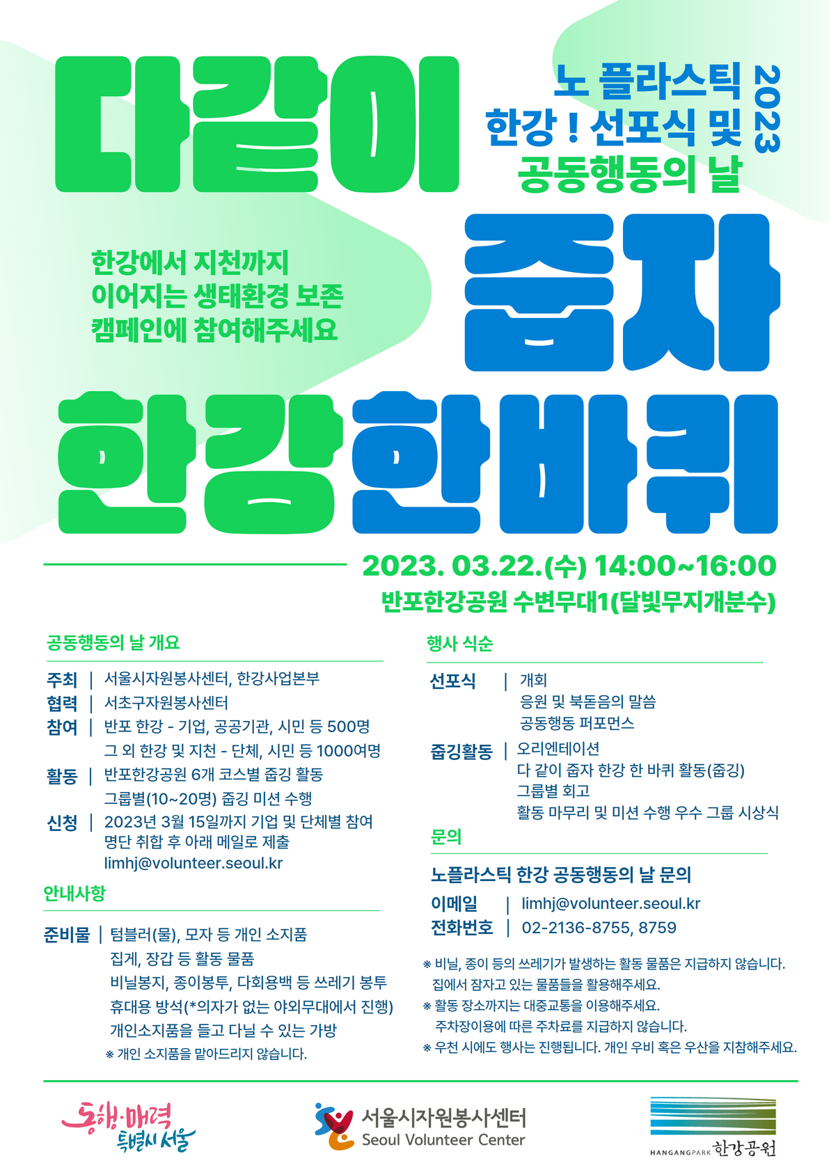 서울시자원봉사센터와 서울시 한강사업본부는 '세계 물의 날(3.22)'을 포함해 '세계 환경의 날(6.5)', '자원순환의 날(9.6)'을 공동행동의 날로 지정, 서울전역 한강과 지천에서 계절별 시민실천 활동을 연중 추진한다.