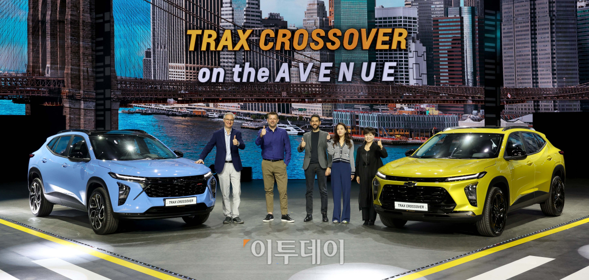 한국지엠이 22일 경기 고양시 킨텍스에서 쉐보레 트랙스 크로스오버 국내 출시행사를 가졌다. 이날 행사장에서 로베르토 럼펠 한국지엠 사장 등 임원진이 차량을 소개하고 있다. 트랙스 크로스오버는 소형 크로스오버유틸리티차량(CUV)으로 세단의 승차감과 SUV의 넓은 시야, 다목적성 등을 두루 갖췄다. 전장 4540㎜, 전폭 1825㎜, 전고 1560㎜ 크기로 넓고 낮은 차체와 차급 대비 넓은 실내 공간이 특징이다. GM의 최신 기술이 적용된 E-터보 프라임 엔진이 탑재됐으며 최고출력 139마력, 최대 토크 22.4㎏·m, 연비 ℓ당 12.7㎞(17인치 모델 기준)의 성능을 낸다. 가격은 2052만~2739만 원 선이다.