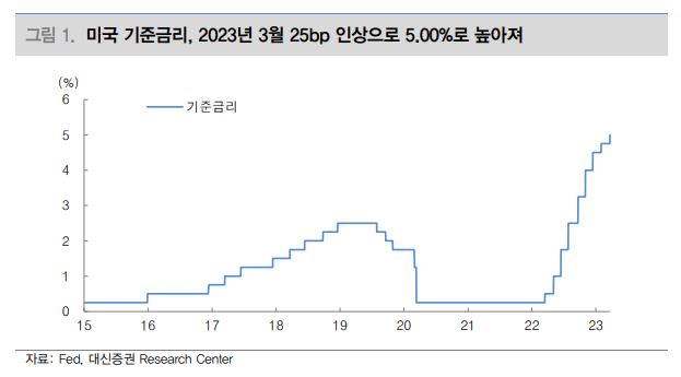 23일 공동락 대신증권 연구원은 “미국 연방준비제도(Fed)가 실리콘밸리은행(SVB) 사태 직후 열린 첫 연방공개시장위원회(FOMC)에서 당사의 예상대로 기준금리를 25bp(1bp=0.01%포인트) 인상했다”며 “금융 시스템 위험의 확산 가능성에도 불구하고 누적된 물가 문제에 대한 대응이 당장 더 시급하다는 판단에 따른 행보”라고 분석했다.