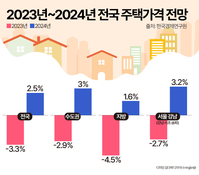 보고서에서 올해 주택 가격은 전국 3.3%. 수도권 2.9%, 지방 4.5%의 하락률을 보일 것으로 예상했다. 서울 강남3구(강남·서초·송파)의 하락폭도 -2.7% 수준에 이른다고 전했다.