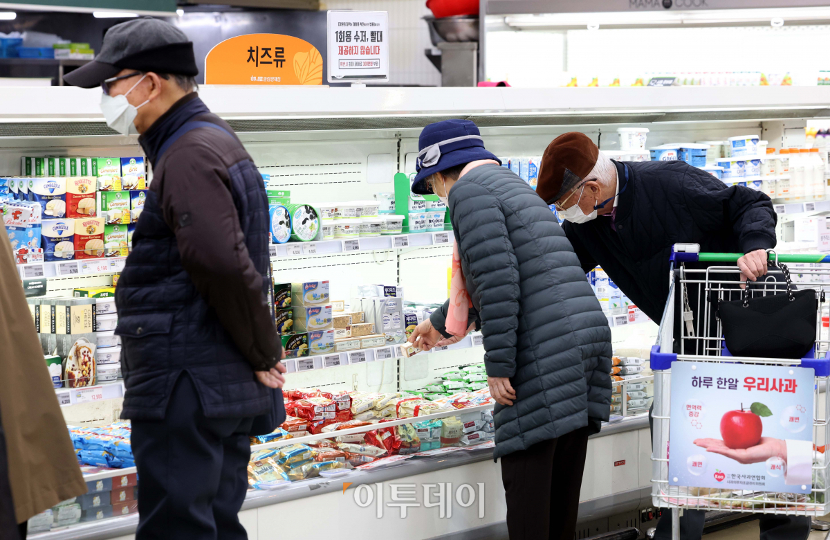 27일 통계청 국가통계포털에 따르면 지난달 가공식품 물가 상승률은 10.4%를 기록했다. 이는 글로벌 금융위기 때인 지난 2009년 4월(11.1%) 이후 13년 10개월 만의 최고치다. 품목별로는 치즈 34.9%, 식용유 28.9%, 밀가루 22.3%, 빵 17.7%, 커피 15.6%, 스낵 과자 14.2%, 아이스크림 13.6% 등이다. 지난달 외식물가지수 역시 115.45로 전년 동월 대비 7.5% 올라 물가안정에 먹구름이 낄 것으로 보인다. 이날 서울의 한 대형마트에서 시민들이 장을 보고 있다.