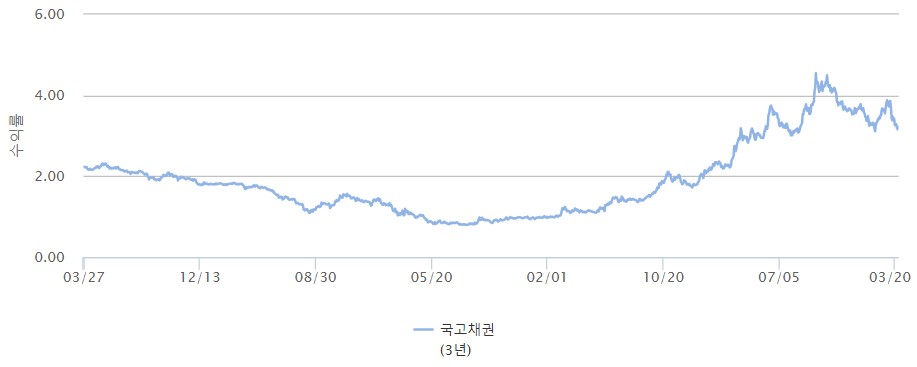 이날 국고채 3년물은 전 거래일보다 0.060%P 상승한 연 3.220%에 거래를 마쳤다. 국채 1년물과 2년물은 전일 대비 각각 0.005%P, 0.064%P 올라 연 3.290%, 연 3.313%를 기록했다.