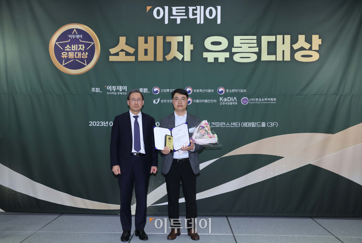 29일 서울 여의도 전경련회관 컨퍼런스센터에서 열린 ‘이투데이 소비자 유통대상’ 시상식에서 소비자만족 부문 최우수상을 수상한 윤성학 농심 부장과 시상자인 김덕헌 이투데이 대표이사가 기념촬영을 하고있다. 이투데이 소비자 유통대상은 진화하는 유통산업을 이끄는 리더를 발굴하고 시상함으로써 유통산업의 발전적인 모델을 공유하고 널리 전파하는 자리다.