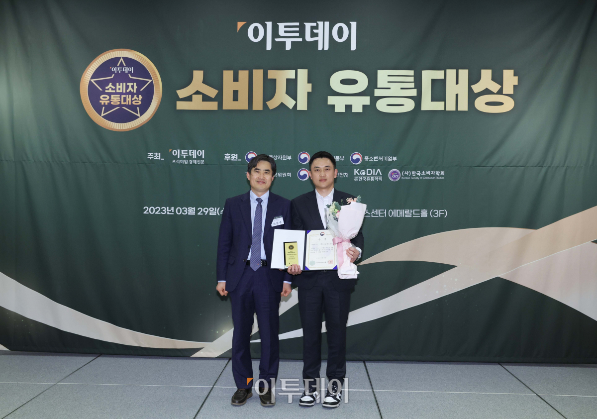 29일 서울 여의도 전경련회관 컨퍼런스센터에서 열린 ‘이투데이 소비자 유통대상’ 시상식에서 유통안전 부문 식품의약품안전처 처장상을 수상한 강윤구 아모레퍼시픽 팀장과 시상자인 신준수 식약처 바이오생약국장이 기념촬영을 하고있다. 이투데이 소비자 유통대상은 진화하는 유통산업을 이끄는 리더를 발굴하고 시상함으로써 유통산업의 발전적인 모델을 공유하고 널리 전파하는 자리다.