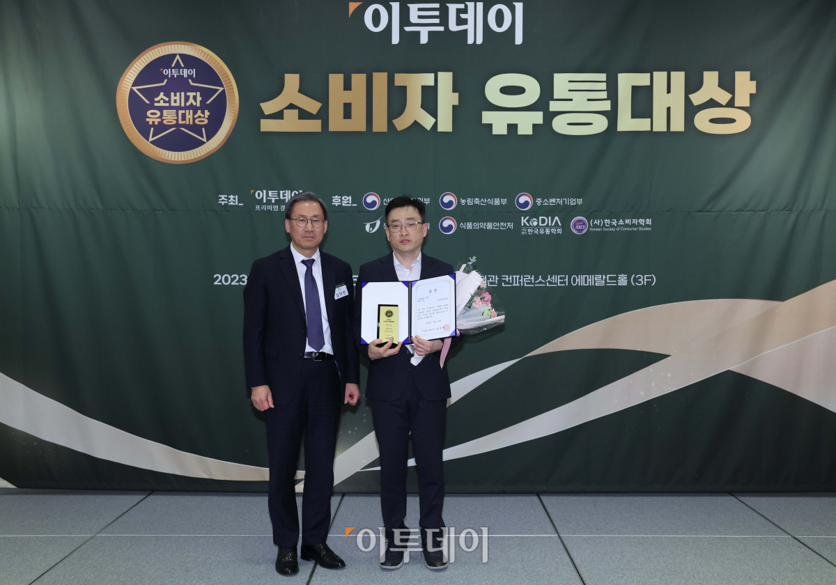 29일 서울 여의도 전경련회관 컨퍼런스센터에서 열린 ‘이투데이 소비자 유통대상’ 시상식에서 상생협렵 부문 최우수상을 수상한 이준무 파리크라상 홍보실장과 시상자인 김덕헌 이투데이 대표이사가 기념촬영을 하고있다. 이투데이 소비자 유통대상은 진화하는 유통산업을 이끄는 리더를 발굴하고 시상함으로써 유통산업의 발전적인 모델을 공유하고 널리 전파하는 자리다.