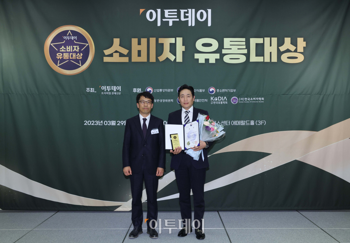 29일 서울 여의도 전경련회관 컨퍼런스센터에서 열린 ‘이투데이 소비자 유통대상’ 시상식에서 종합대상인 산업통상자원부 장관상을 수상한 박용 삼성바이오로직스 상무와 시상자인 황수성 산업통상자원부 산업정책실장이 기념촬영을 하고있다. 이투데이 소비자 유통대상은 진화하는 유통산업을 이끄는 리더를 발굴하고 시상함으로써 유통산업의 발전적인 모델을 공유하고 널리 전파하는 자리다.