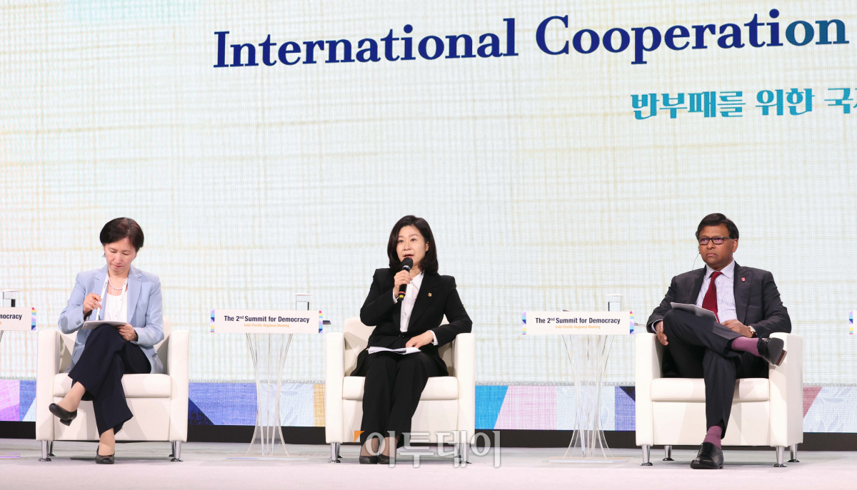이노공 법무부 차관이 30일 오전 서울 중구 신라호텔에서 열린 '제2차 민주주의 정상회의 인태지역 회의'에서 반부패를 위한 국제협력을 주제로 기조연설을 하고 있다.