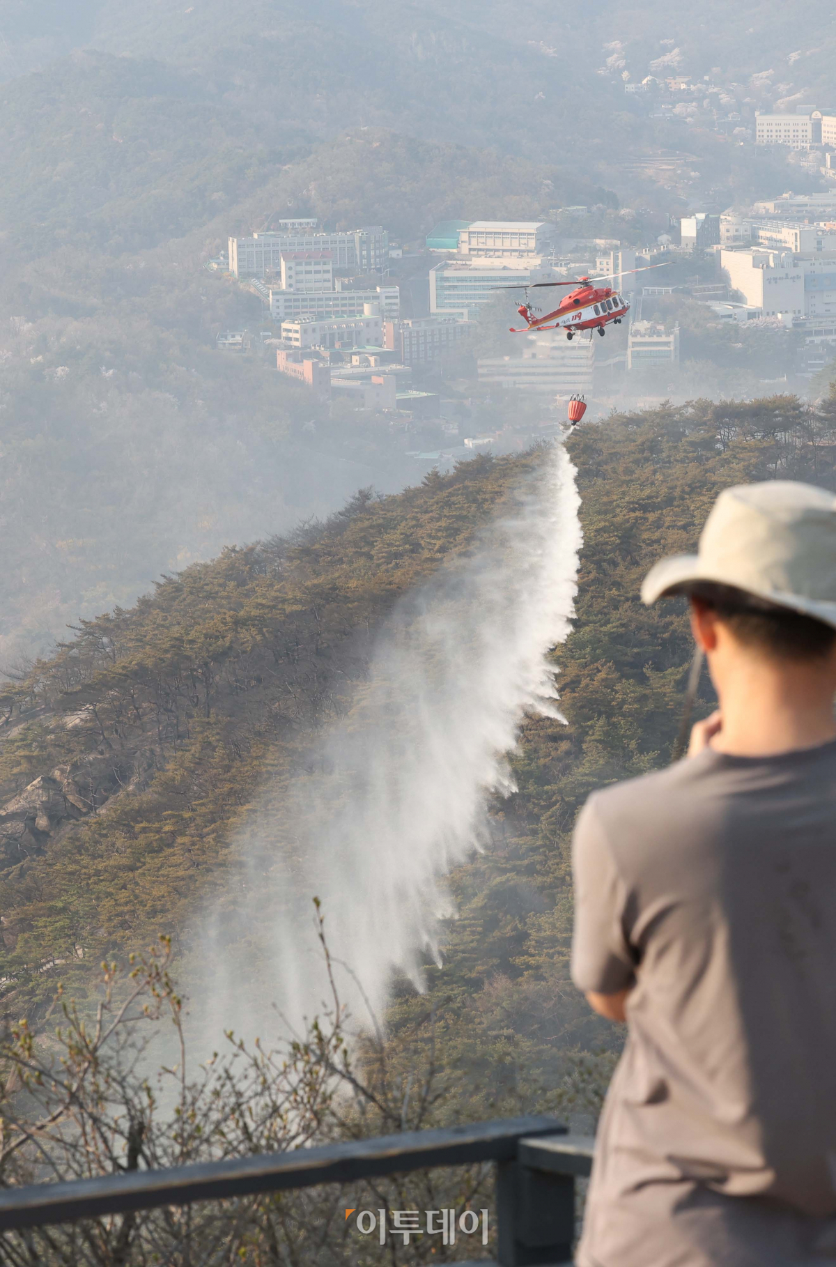 2일 오전 서울 종로구 인왕산에서 화재가 발생한 가운데 이날 오후 소방헬기가 진화 작업을 하고 있다.