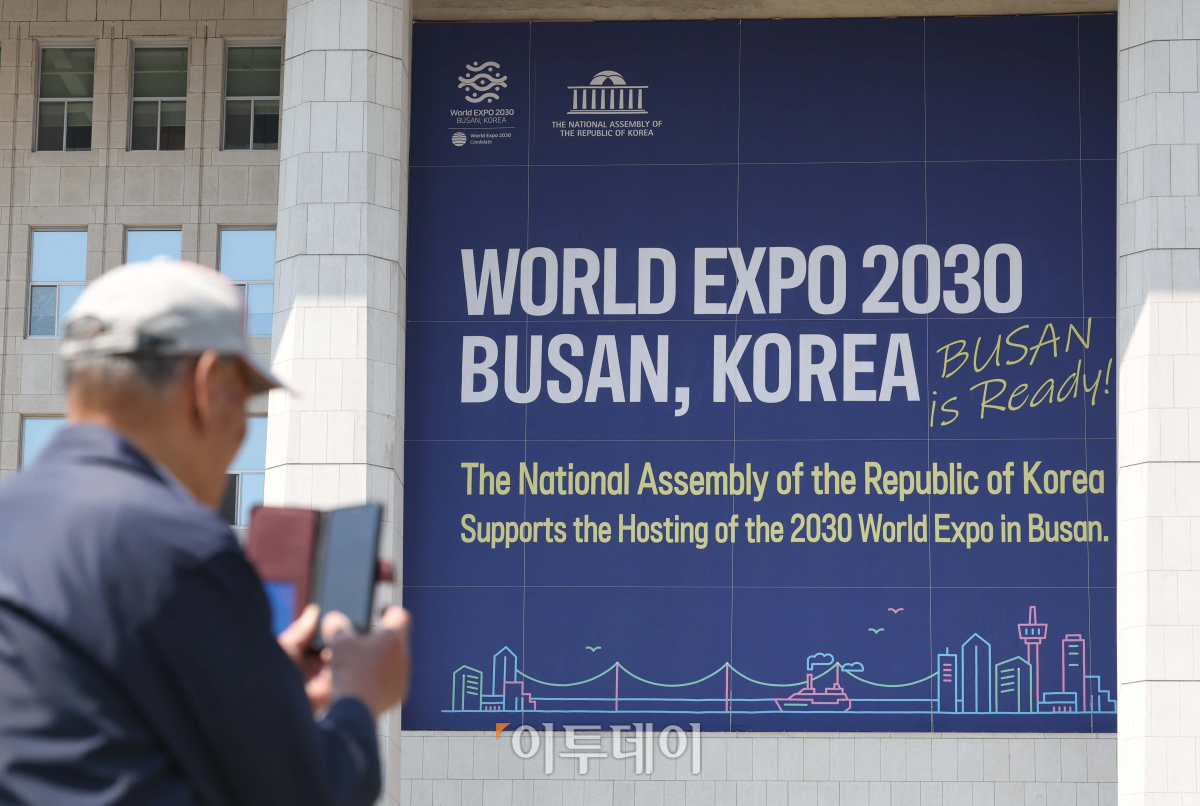 2030부산세계박람회(월드엑스포)유치 준비 상황을 점검하기 위한 국제박람회기구(BIE) 실사단이 방한한 2일 서울 여의도 국회에 부산엑스포 유치를 기원하는 현수막이 게시돼 있다.