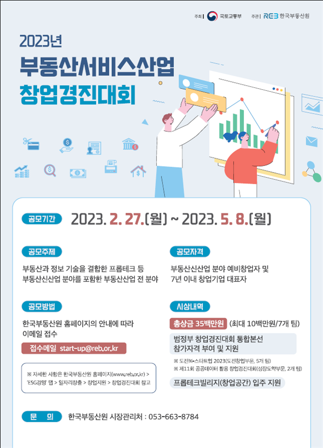 한국부동산원은 부동산 서비스 산업을 선도할 유망 스타트업을 발굴하고, 청년 창업인의 도전과 정착을 지원하기 위한 ‘2023년 부동산 서비스 산업 창업 경진대회’를 개최한다고 4일 밝혔다.