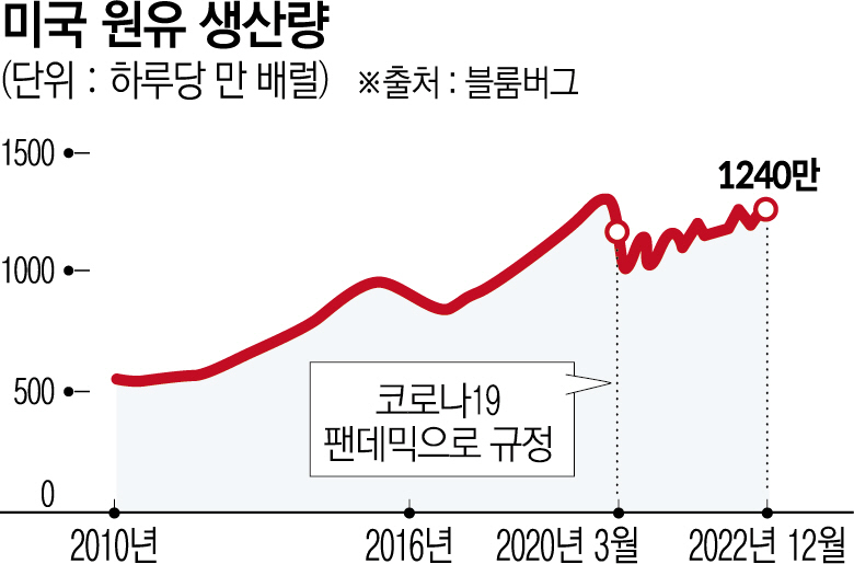 미국의 현재 원유 생산 증가율은 2020년 이전의 절반 수준에도 못 미치고 있으며, 생산량 자체도 신종 코로나바이러스 감염증(코로나19) 팬데믹(전염병 대유행) 이전 수준을 회복하지 못하고 있다. 미국 최대 셰일 유전지대인 퍼미언 분지의 올해 일일 생산량은 50만 배럴 정도다. 이는 전날 사우디를 비롯한 OPEC+ 일부 회원국들이 발표한 총감산량(약 116만 배럴)의 절반 이하다.