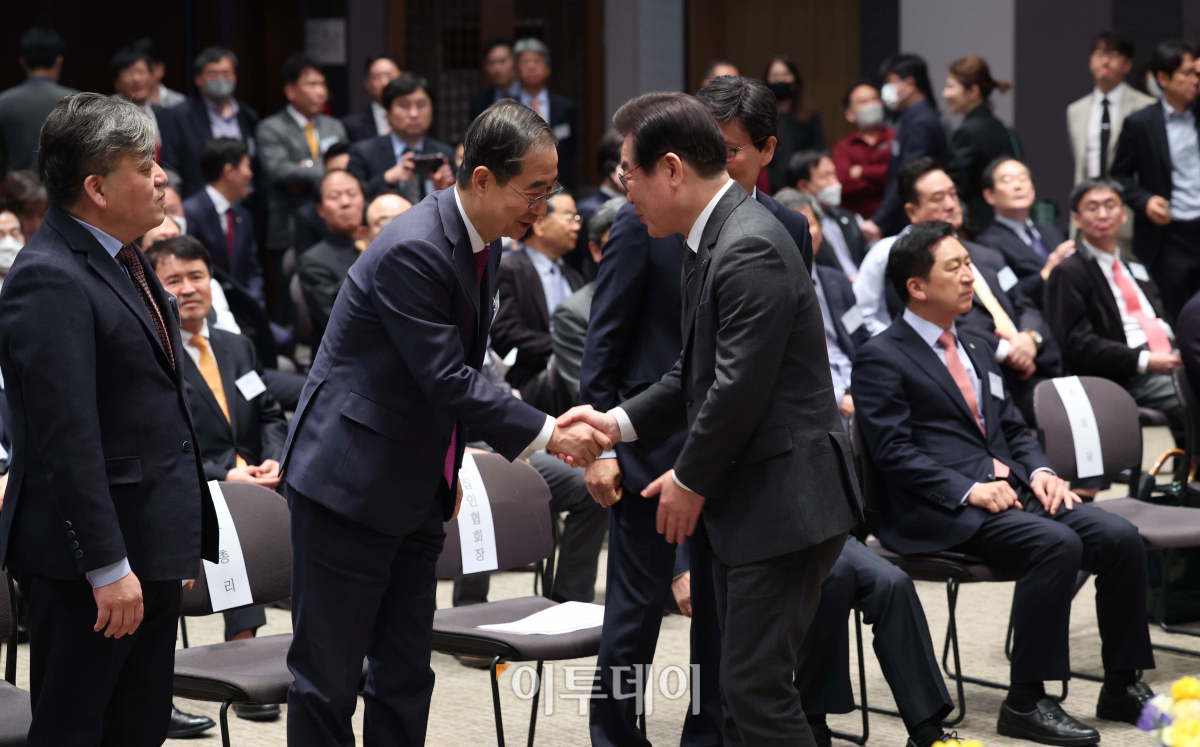 한덕수(왼쪽) 국무총리와 이재명 더불어민주당 대표가 6일 서울 중구 프레스센터에서 열린 제67회 신문의날 기념식에서 인사하고 있다.