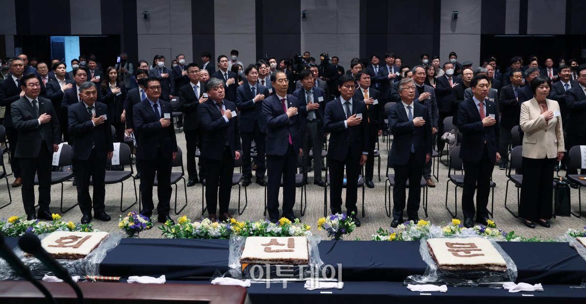 한덕수 국무총리와 김기현 국민의힘 대표, 이재명 더불어민주당 대표, 이정미 정의당 대표 등이 6일 서울 중구 프레스센터에서 열린 제67회 신문의날 기념식에서 국민의례를 하고 있다.