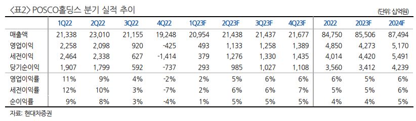 7일 박현욱 현대차증권 연구원은 “POSCO홀딩스의 1분기 매출액은 20조9541억 원, 영업이익은 4925억 원, 세전이익은 3792억 원”이라며 “영업이익은 전년 동기 대비 -78%, 전 분기 대비 흑자전환을 예상한다”고 했다.
