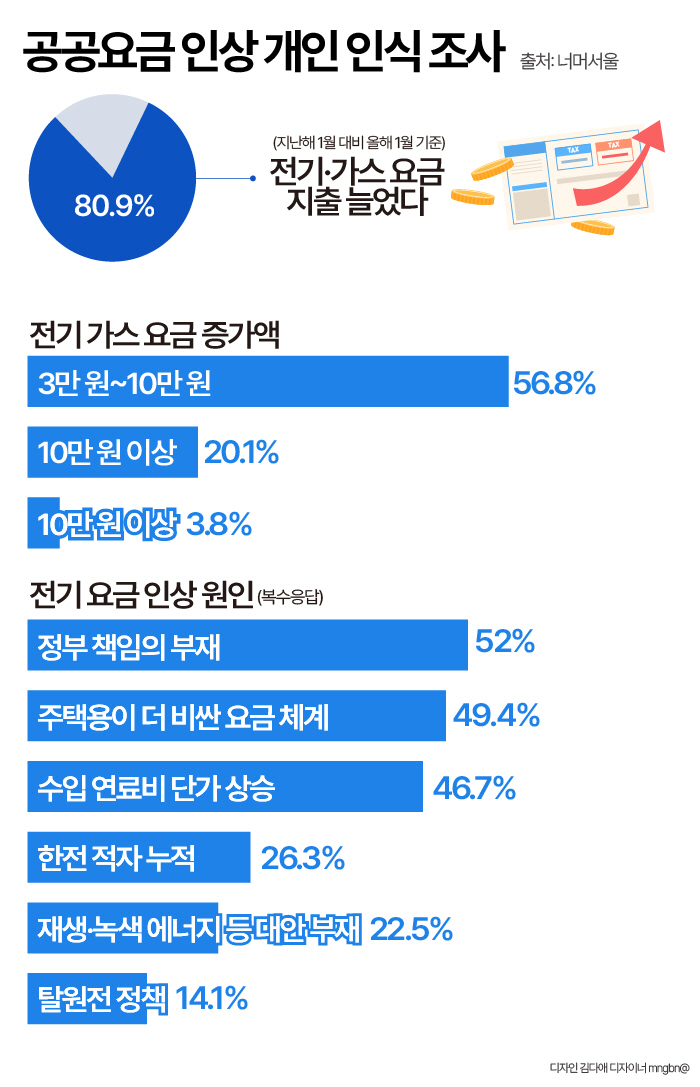 조사 대상의 80.9%는 지난해 1월 대비 올해 1월 전기·가스 요금 지출이 늘어났다고 답했다.