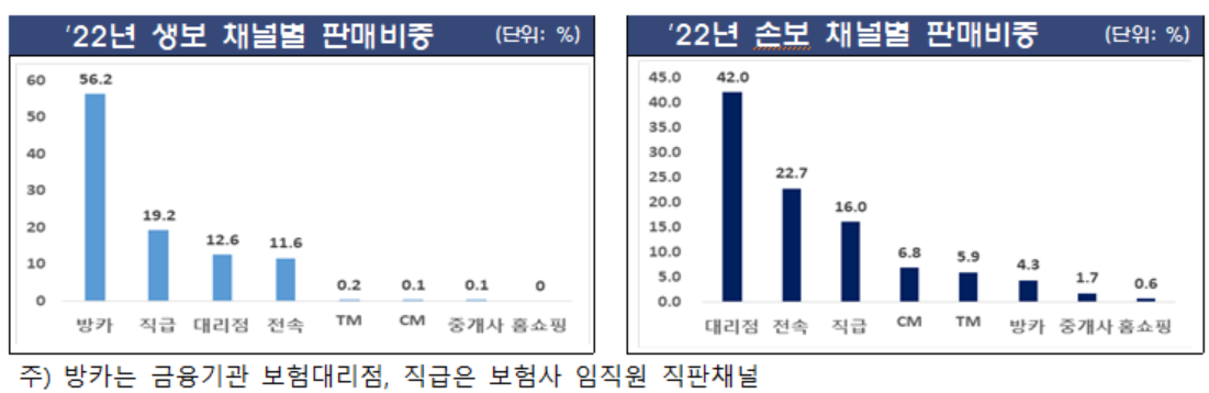 금융감독원은 10일 '보험회사 판매채널 영업효율 분석'을 통해 이같이 밝혔다. 채널별 판매 비중은 생보사(초회 보험료 기준)는 금융기관 보험 대리점(56.2%), 직급(19.2%), 대리점(12.6%), 전속(11.6%) 순으로 나타났다. 손보사(원수보험료 기준)는 대리점(42.0%), 전속(22.7%), 직급(16.0%), CM(6.8%), TM(5.9%) 및 금융기관 보험대리점(4.3%) 순이다.