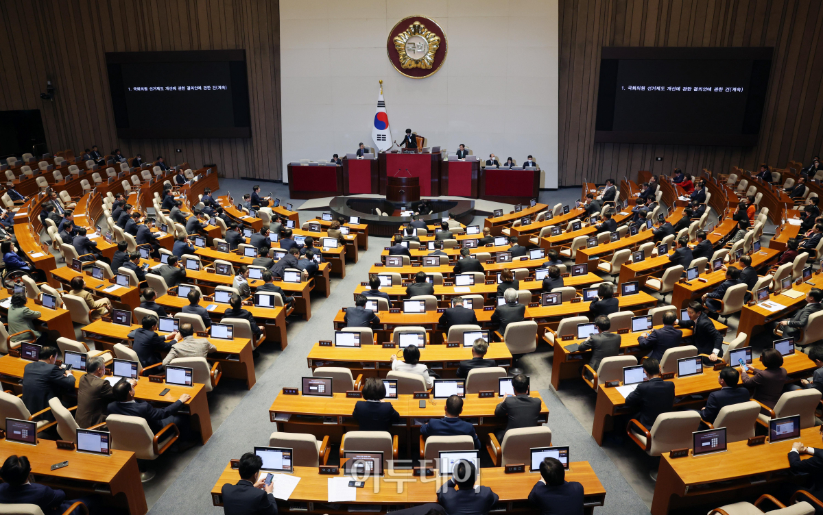 10일 서울 여의도 국회 본회의장에서 제405회국회(임시회) 제1차 국회의원 선거제도 개선에 관한 결의안 심사를 위한 전원위원회가 열리고 있다.