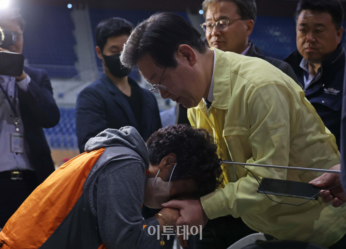 이재명 더불어민주당 대표가 12일 오후 강원 강릉시 아이스아레나에 마련된 임시대피소에 머무는 산불 피해 이재민들을 위로하고 있다.