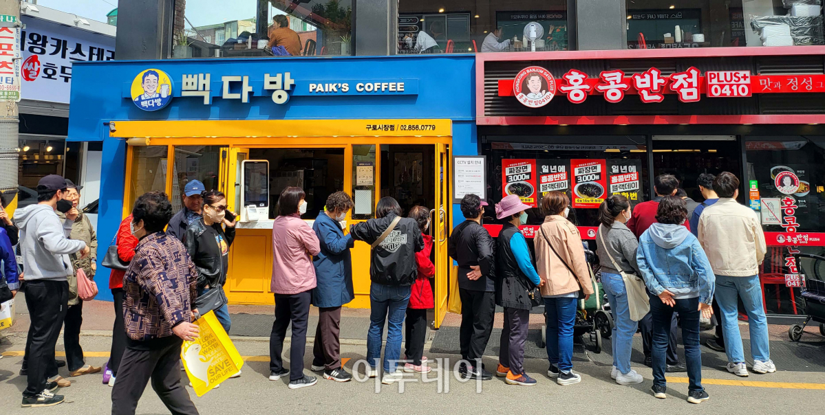 계속되는 원부자재 가격 상승 등으로 짜장면 가격이 평균 6000원에 달하는 가운데 업계가 14일 ‘블랙데이’를 맞아 할인 프로모션에 나서고 있다. 이날 서울의 한 홍콩반점0410 앞에 3000원 짜장면을 먹으려는 시민들이 줄지어 서 있다. 블랙데이(4월 14일)는 밸런타인데이와 화이트데이에 선물을 받지 못한 사람들이 짜장면을 먹으면서 아쉬운 마음을 달래는 비공식 기념일이다.