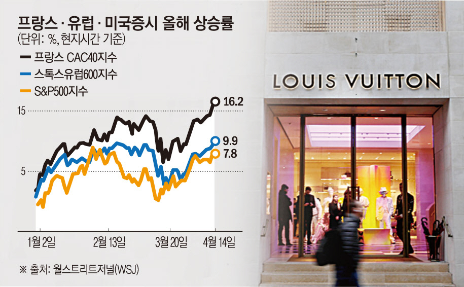 지난해 4분기 시작 후 지수 상승분의 약 3분의 1은 에르메스와 케링, 루이비통모에헤네시(LVMH), 로레알 등 명품기업의 몫이었다. 이들 주가는 이 기간 각각 61%, 25%, 45%, 28% 상승했다. 에르메스와 LVMH 주가 역시 전날 사상 최고치를 경신했다.