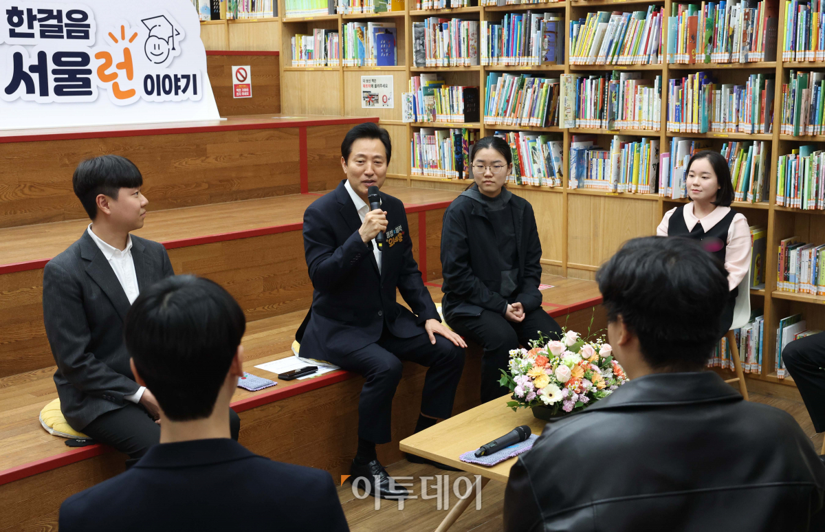 오세훈 서울시장이 17일 서울 중구 서울도서관에서 열린 서울런 우수 학생 초청 간담회에서 인사말을 하고 있다.