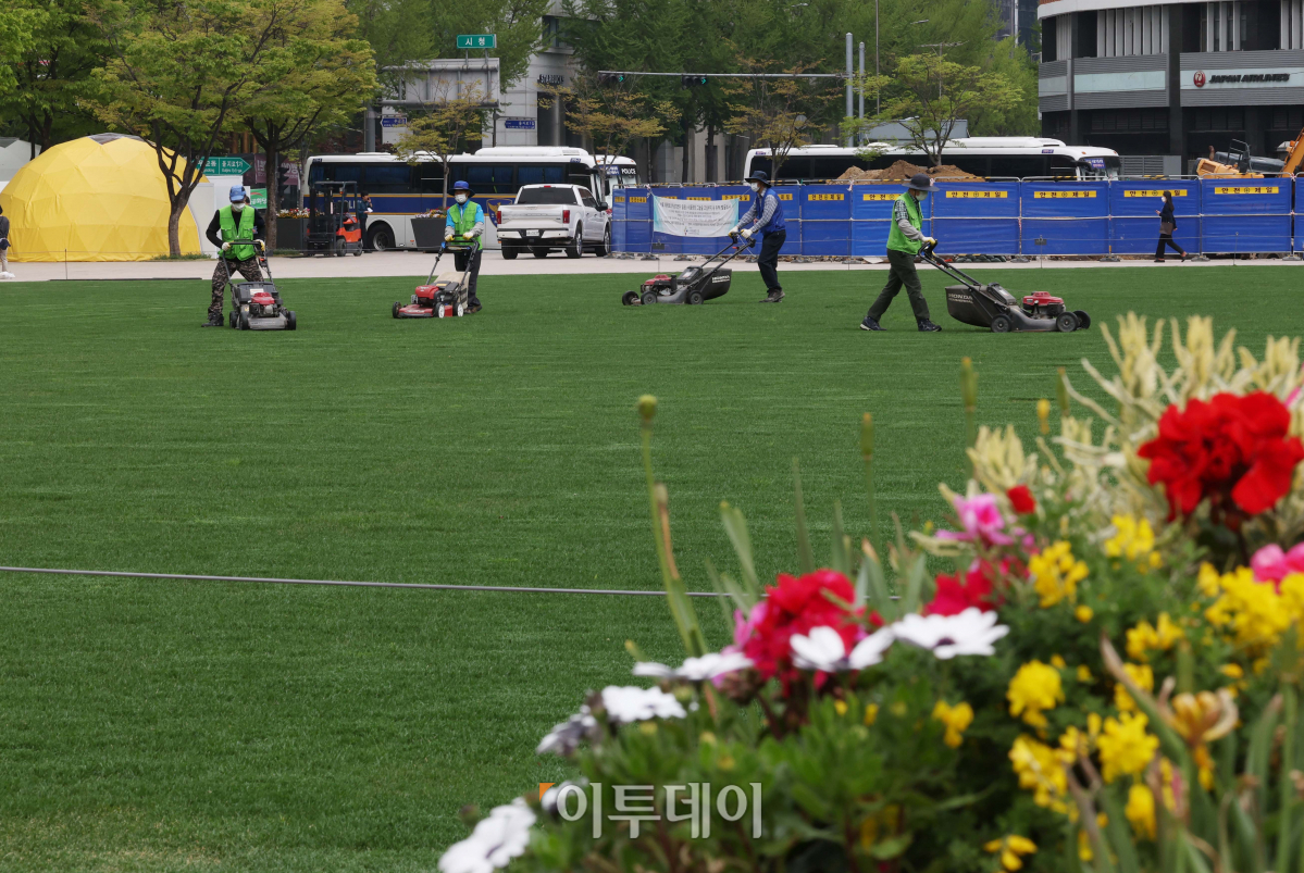 17일 서울 중구 서울광장에서 관계자들이 제초작업을 하고 있다. 한편 ‘책 읽는 서울광장’ 등 서울광장에서 주말 대규모 행사를 앞두고 있는 서울시는 이날 이태원 참사 분향소의 자진철거를 유가족 측에 촉구했다.