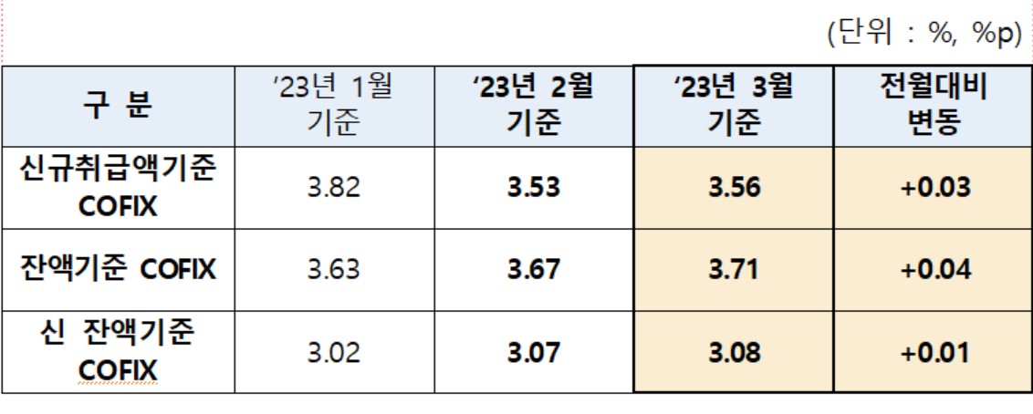잔액기준 코픽스는 3.71%로 전월대비 0.04%p 늘었다. 신 잔액기준 코픽스 역시 3.08%를 기록해 전월대비 0.01%p 상승했다.