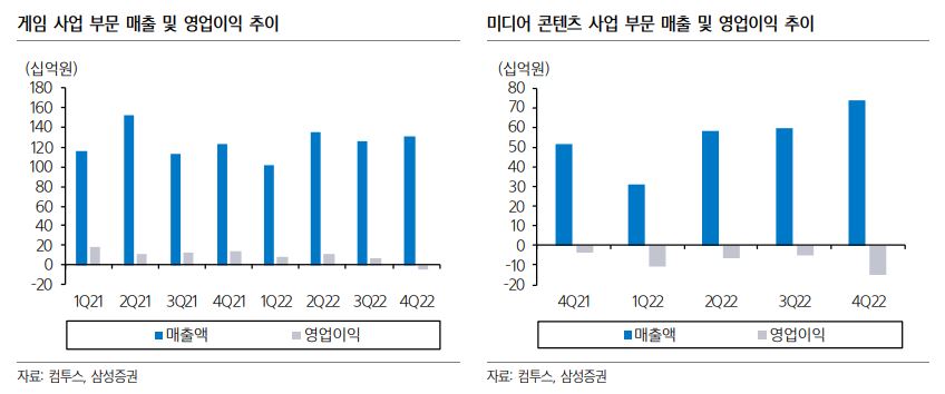 오 연구원은 “미디어 매출은 비수기 효과로 매출이 40% 감소해 전체 매출 하락을 이끌 전망”이라며 “크로니클 흥행에도 불구하고 미디어 사업부가 1분기에도 126억 원의 영업적자를 기록해 컨센서스(시장 전망치) 영업적자 71억 원을 하회할 것”이라고 전망했다.