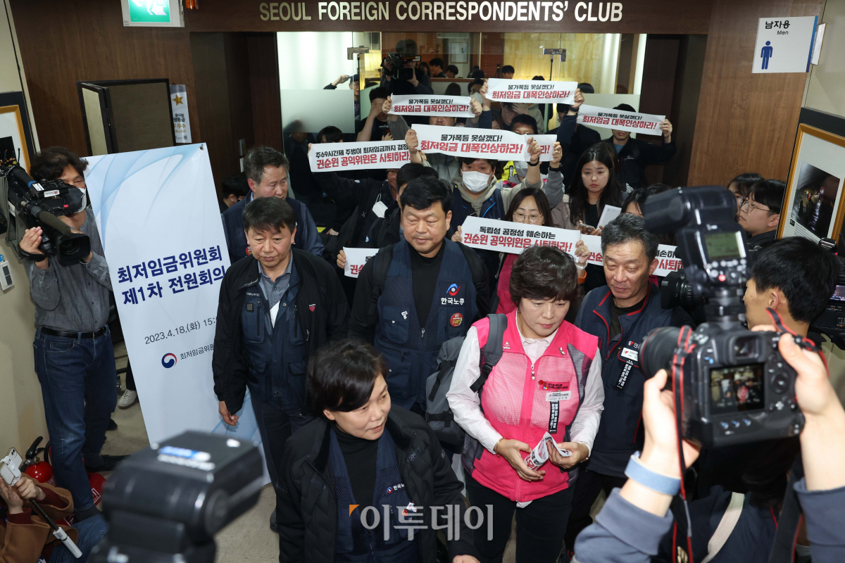 18일 서울 중구 프레스센터에서 최저임금위원회 제1차 전원회의가 파행돼 근로자위원 등이 회의장을 나서고 있다.