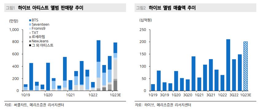 24일 정지수 메리츠증권 연구원은 “올해 1분기 연결 실적은 매출액 4775억 원, 영업이익 479억 원으로 시장 컨센서스(영업이익 447억 원)를 상회할 전망”이라며 “1월 뉴진스 ‘OMG’와 TXT 미니앨범 ‘TEPTATION’, 3월 부석순 싱글앨범이 판매 호조를 보이며 앨범 매출액은 2010억 원을 전망한다”고 했다.
