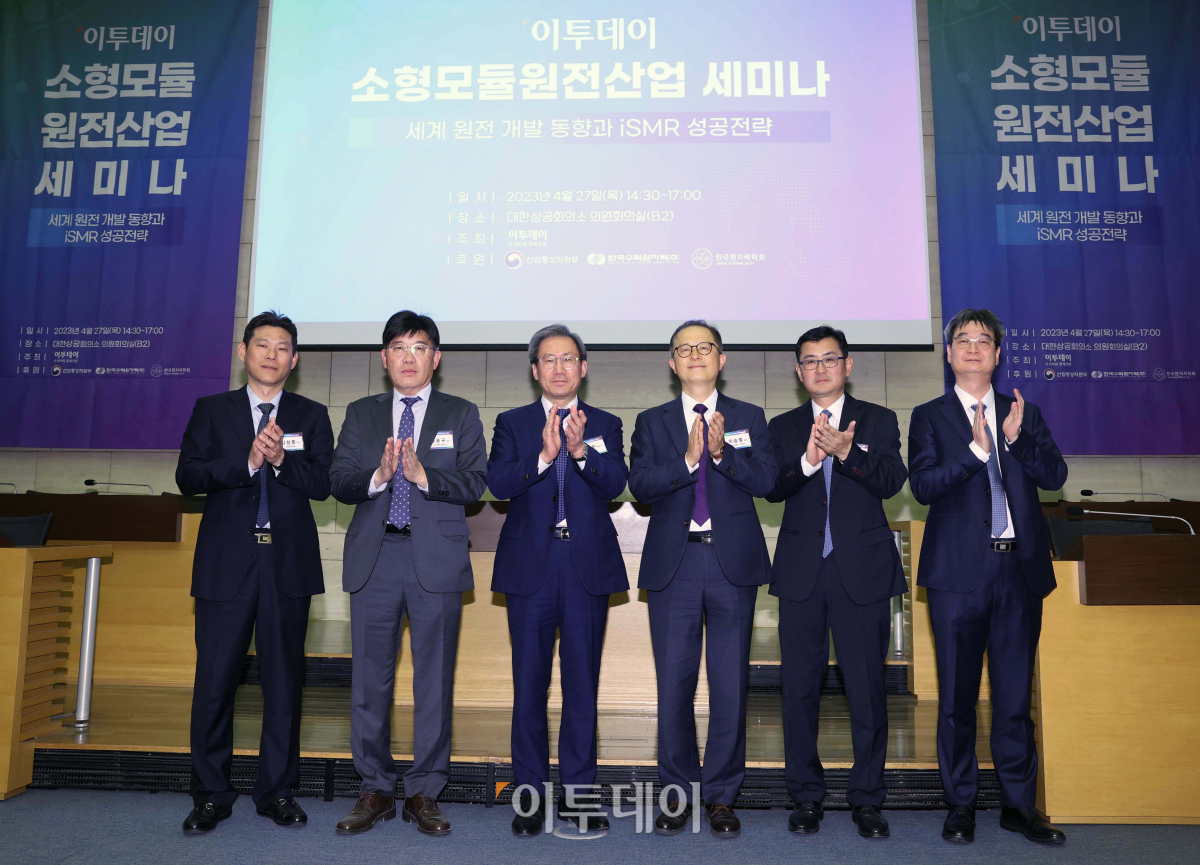 27일 서울 중구 대한상공회의소에서 열린 이투데이 ‘소형모듈원전산업’ 세미나에서 이승렬 산업통상자원부 원전산업정책국장과 김덕헌 이투데이 대표이사 등 내빈들이 기념촬영을 하고있다. ‘세계 원전 개발 동향과 iSMR 성공전략’을 주제로 열린 이번 소형모듈원전산업 세미나는 대한민국 미래 원전산업의 방향을 짚어 볼 수 있는 자리다. 사진 왼쪽부터 김성중 한양대학교 원자력공학과 교수, 김용규 두산에너빌리티 원자력설계 상무, 김 대표, 이 국장, 최광식 혁신형 SMR기술개발사업단 사업운영실장, 심형진 서울대학교 원자핵공학과 교수.