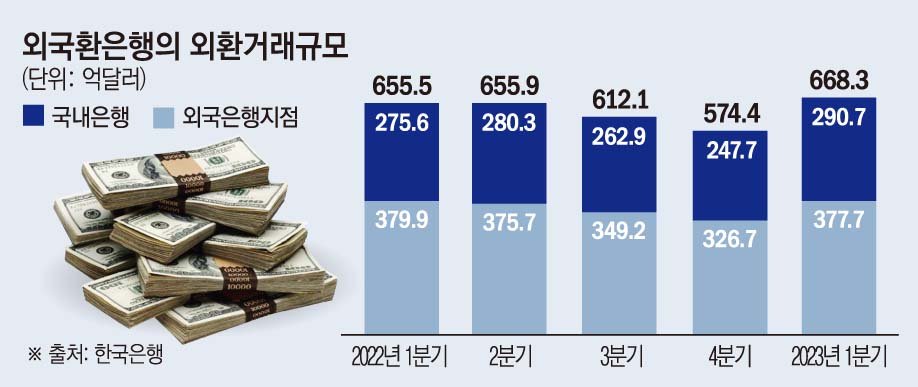 한국은행이 2일 발표한 ‘2023년 1/4분기 중 외국환은행의 외환거래동향’에 따르면 1분기 중 외국환은행의 일평균 외환거래(현물환 및 외환파생상품 거래) 규모는 668억3000만 달러를 기록했다.