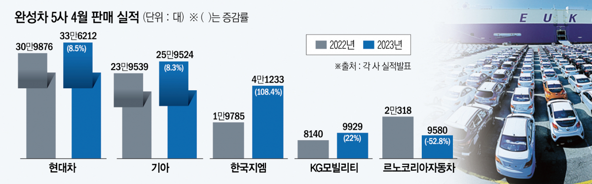 기업별 판매 실적은 △현대차 33만6212대(+8.5%) △기아 25만9524대(+8.3%) △한국지엠 4만1233대(+108.4%) △KG모빌리티 9929대(+22.0%) △르노코리아 9580대(-52.8%) 등이다.