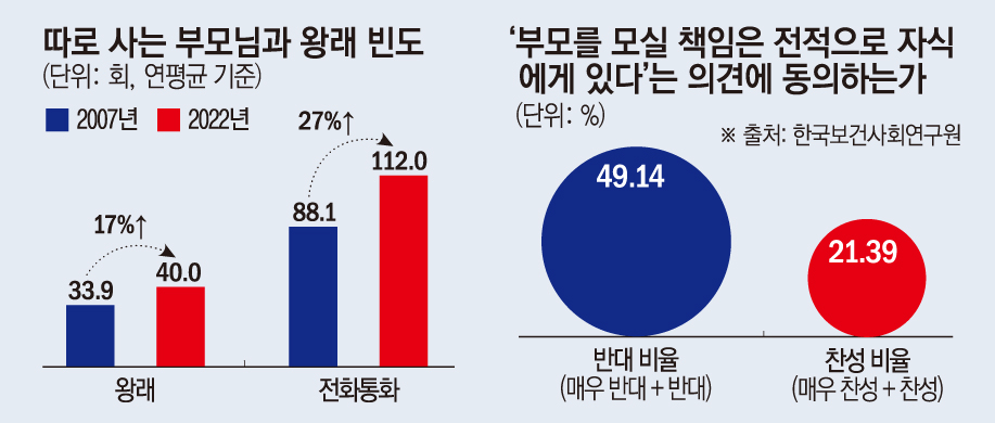 따로 사는 부모와 왕래나 전화 연락 빈도는 과거 대비 늘어났다. 15년 전인 2007년 진행한 같은 조사에서 왕래 횟수는 평균 33.9회, 전화 연락은 88.1회였다. 15년 사이 왕래 빈도는 약 17%, 전화 연락 빈도는 약 27% 증가했다.