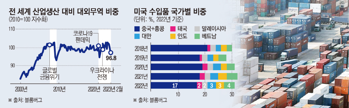 재세계화를 부추긴 가장 큰 요인은 미국과 중국의 갈등이다. 지난해 미·중 디커플링 속에 미국의 관세가 부과된 중국산 제품 수입은 무역 전쟁이 시작되기 전인 2017년 대비 14% 감소했다. 대신 미국 전체 수입품에서 대만과 인도, 베트남, 태국, 말레이시아가 차지하는 비중이 늘었다. 여전히 중국과 홍콩이 차지하는 수입 비중은 17%로 가장 크지만, 이들 5개국 합산도 14%에 달한다.