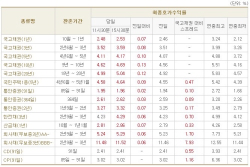 장기물인 10년물은 13bp 상승해 4.69%, 20년물은 12bp 상승해 5.04%로 각각 고시됐다.