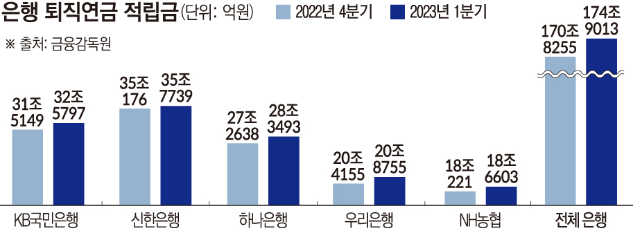 5대 은행(KB국민·신한·하나·우리·NH농협)의 1분기 적립금은 136조2387억 원으로 전체 퇴직연금 시장(338조 원)의 약 40%를 차지했다. 은행 중 적립금이 가장 큰 곳은 신한은행으로 35조7739억 원을 기록했다. 전분기(35조176억 원)보다 7563억 원 늘어난 규모다. 이어 KB국민은행이 31조5149억 원에서 32조5797억 원으로 1조648억 원 증가했다.