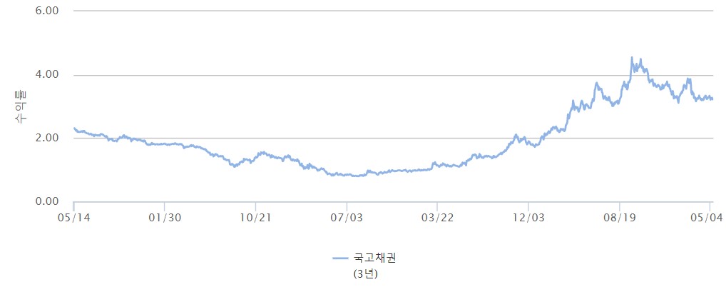 이날 국고채 3년물은 전 거래일보다 0.005%P 상승한 연 3.225%에 거래를 마쳤다. 국채 1년물과 2년물도 전일보다 각각 0.006%P, 0.012%P 오른 연 3.350%와 연 3.339%에 상승 마감했다. 국고채 5년물은 전 거래일보다 0.005%P 하락한 연 3.200%를 기록했다.