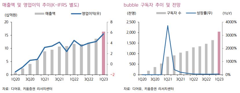 15일 이남수 키움증권 연구원은 “1분기 매출액은 164억 원, 영업이익은 57억 원으로 컨센서스(시장 전망치)에 부합했다”며 “1분기 평균 구독수는 205만으로, 전 분기(165만)보다 40만이 증가해 분기 기준 가장 큰 폭의 구독수 변동이 발생했다”고 했다.