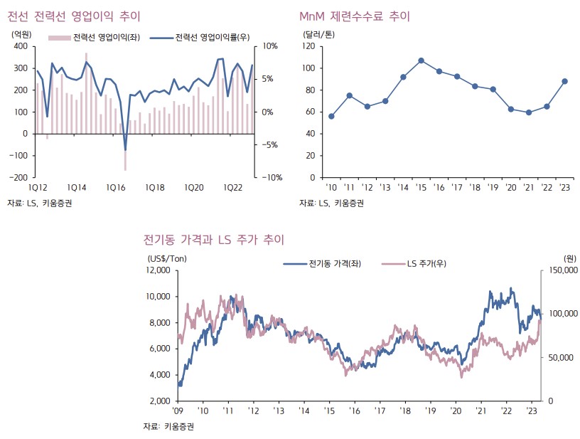 키움증권은 16일 LS에 대해 일렉트릭의 호실적과 함께 전선의 전력선, 엠트론의 트랙터, I&D의 통신선 등이 선전했지만, MnM은 공장 정기 보수 영향과 함께 귀금속 및 부산물 가격 하락으로 부진했다며 상승여력을 감안해 투자의견을 아웃퍼폼으로 하향하되, 목표주가는 기존 10만 원에서 11만 원으로 10% 상향 조정했다. 전 거래일 기준 현재 주가는 9만2600원이다.